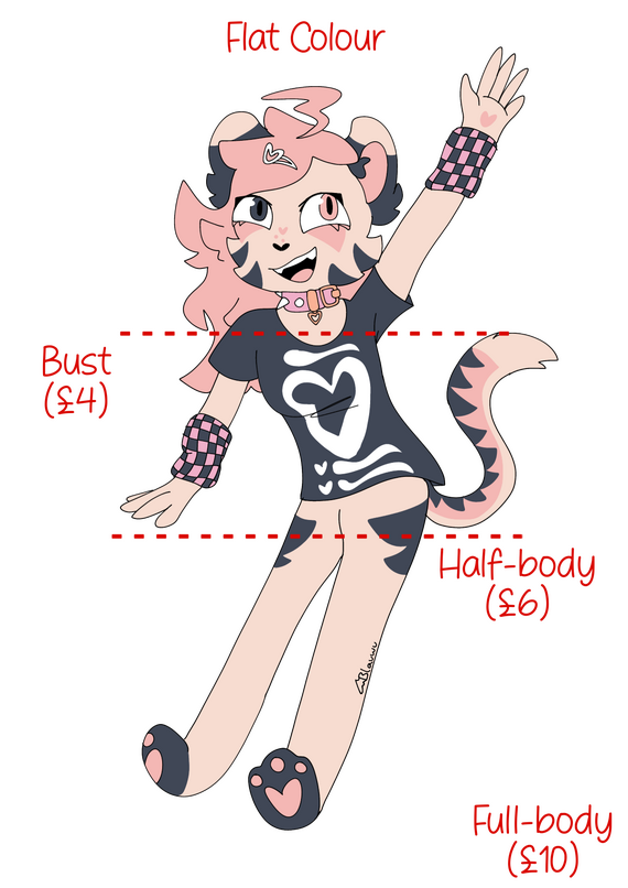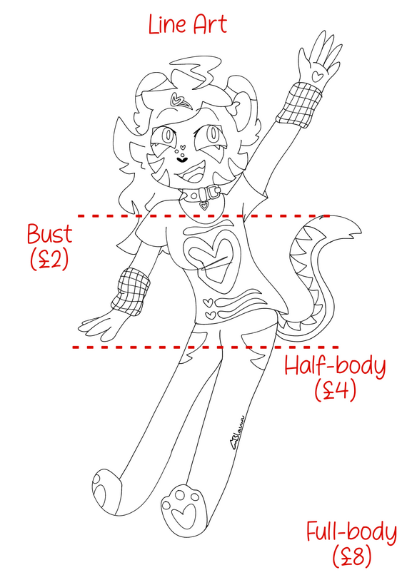 Very simple characters (e.g an object with stick figure legs) and objects on their own cost the same as half of a bust. Line art would be £1, flat colour would be £2 and shaded would be £4.