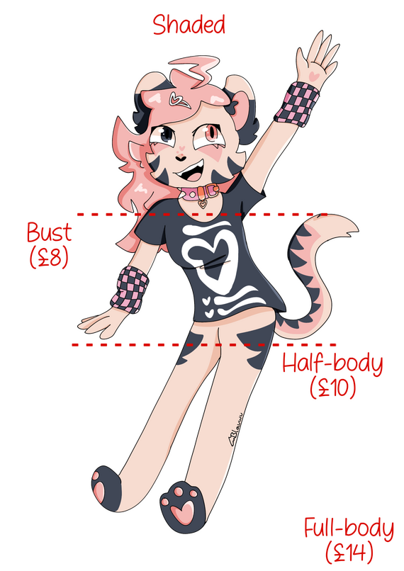 Extra characters add 50% to the price. For example, if you ordered a shaded full-body of two characters, it would be £14 for one character and £7 for the other (coming out to a total of £21).